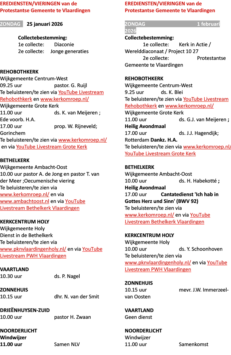 In de komende periode zijn we binnen de PKN in Vlaardingen met elkaar in gesprek over de toekomst van de drie wijken Ambacht-Oost, Holy en Centrum-West. We doen dat stap voor stap, met ruimte voor kennismaking, ontmoeting en het delen van wat ons drijft. In dat kader organiseren we op donderdag 12 februari een avond voor iedereen die zich op welke manier dan ook betrokken voelt bij of bezighoudt met de eredienst. Het wordt een avond van kennismaking en verbinding, waarin we elkaar ontmoeten en samen stilstaan bij de vraag waarom we doen wat we doen. Meer informatie volgt later Annabell de Jong (BK), Petra Nijboer (Holy),Hugo Habekotté (CW)