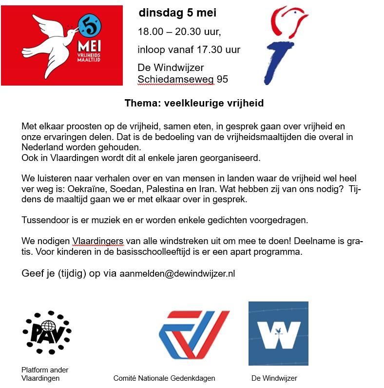 Een uitnodiging wordt meegestuurd voor de Vrijheidsmaaltijd in de Windwijzer op 5 mei
